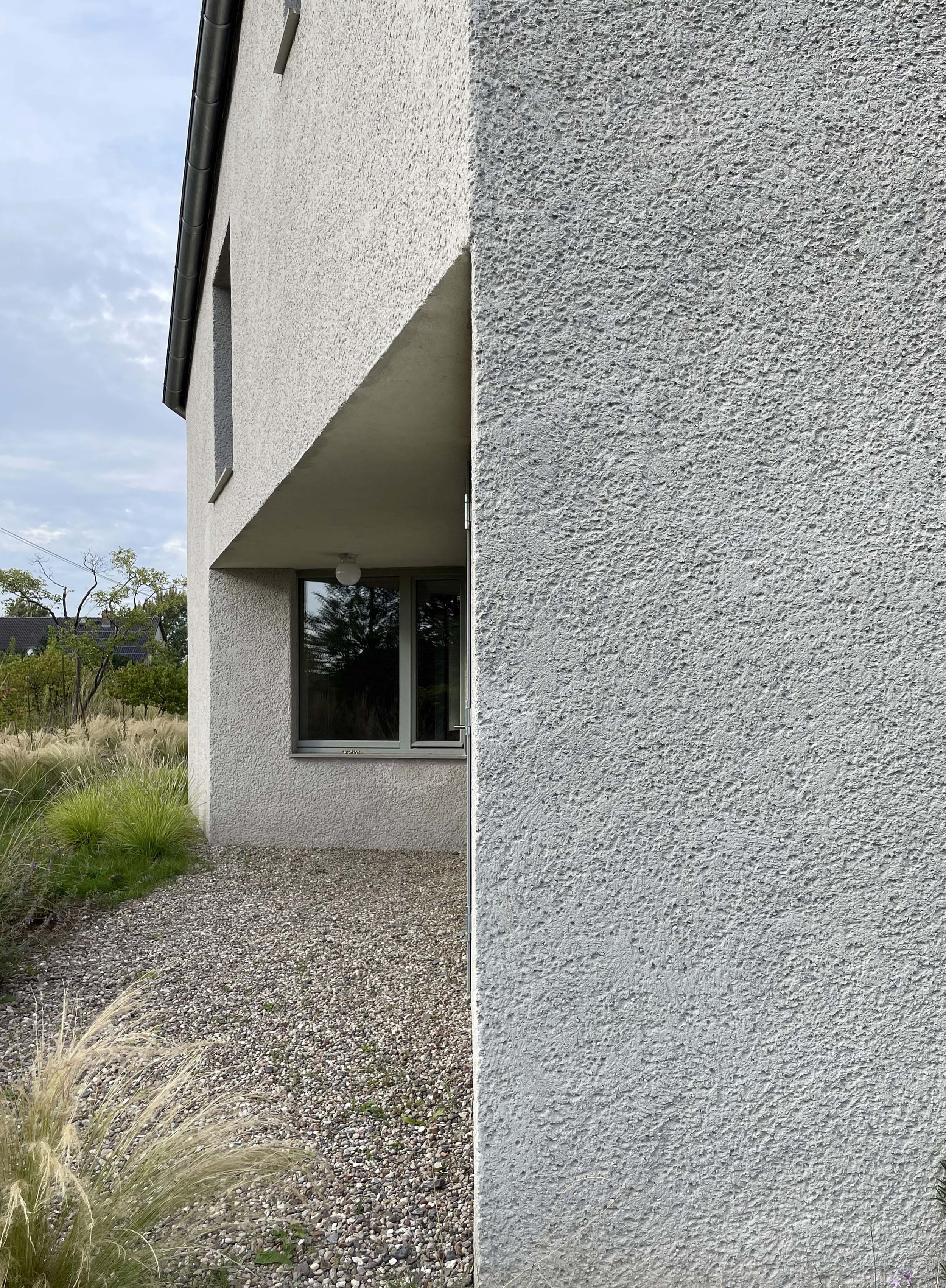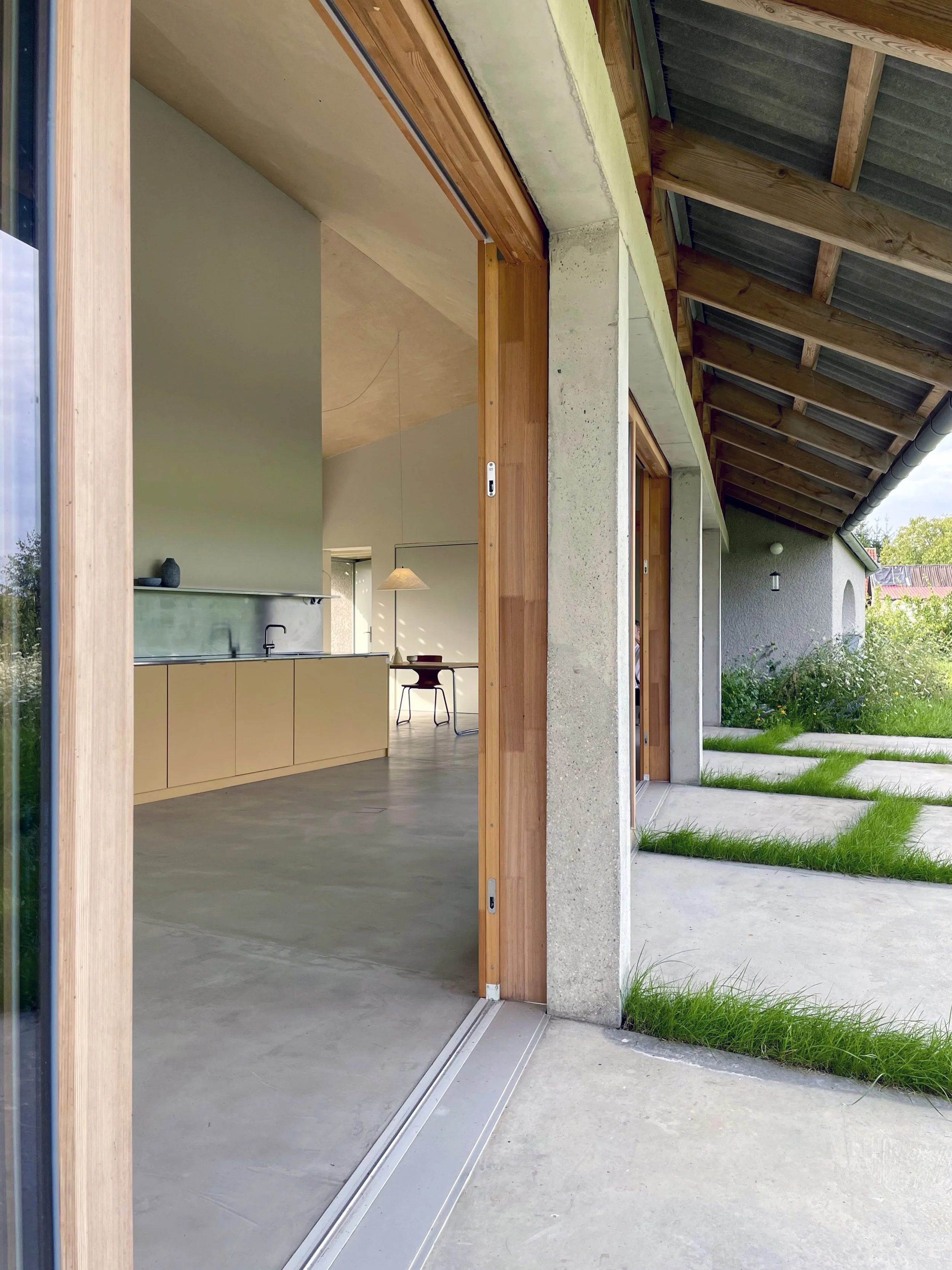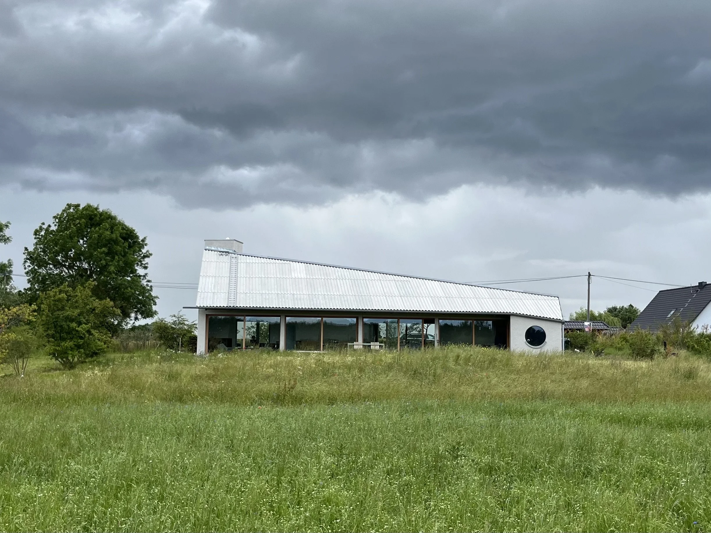 House in Rittgarten is a single-family home, designed in collaboration with Felix Xylander-Swannell Architects and located a couple of hours north of Berlin in the Uckermark region of Germany. The house is situated on a large 6000m2 plot in the middle of a typical linear DDR village settlement („Siedlungsbau“), built as a satelite development to the more historical settlement and estate of Rittgarten just 1 kilometre away. The project uses the concept of a diagonal line as its organising principle, allocating service and entrance spaces towards the street while twisting the living spaces back towards the wildflower garden at the rear of the house and onwards to the original village beyond.